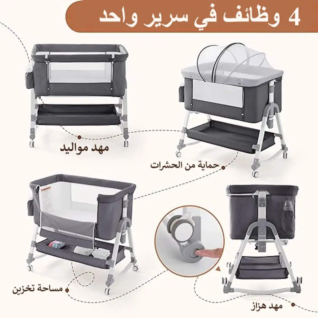 سرير أطفال 4 في 1 هو الحل المثالي لكل أم تبحث عن الراحة والأمان لطفلها. يتميز بتصميم ذكي متعدد الوظائف، حيث يمكن استخدامه كسرير أطفال مستقل، مهد هزاز، سرير بجانب السرير متصل بسرير الوالدين، أو سرير مع ناموسية للحماية. بفضل هذه التحويلات المتنوعة، يلبي السرير جميع احتياجات الطفل منذ الولادة وحتى المراحل الأولى من النمو.