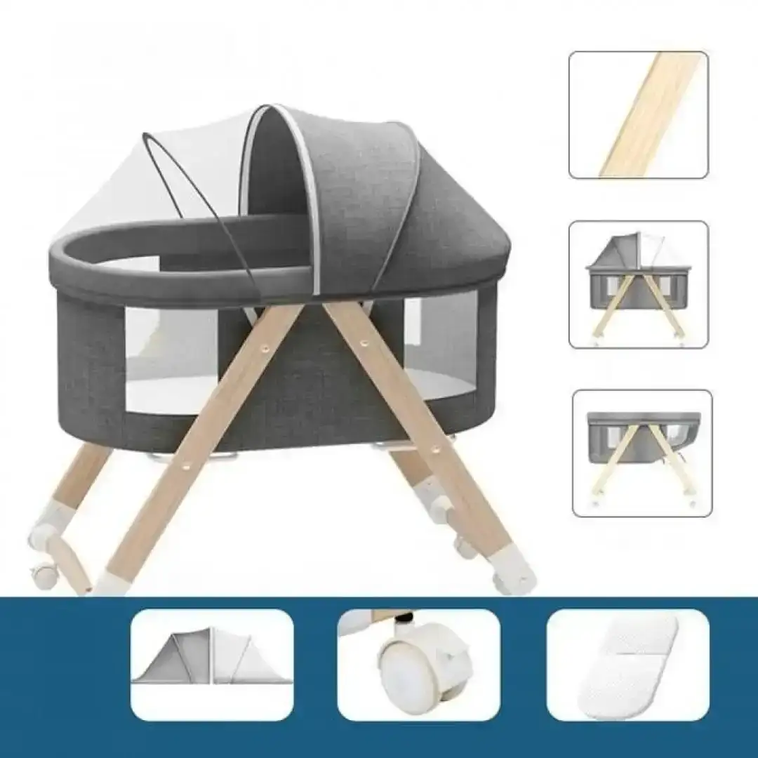 يمكن تعديل السرير بسهولة بين وضعية الدفع ووضعية المهد باستخدام العجلات المزودة بقفل أمان. كما تأتي الناموسية المدمجة مع تصميم مظلل وشفاف يحمي الطفل من الحشرات ويوفر تهوية مثالية. كما يتيح التصميم القابل للإمالة سهولة إطعام الطفل ويساعد على منع ارتجاع الحليب، مما يجعله خيارًا عمليًا ومريحًا للوالدين.
