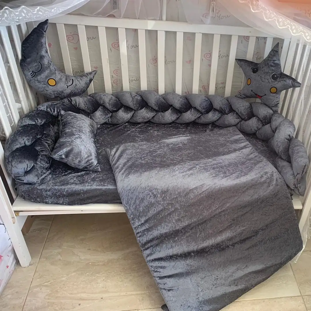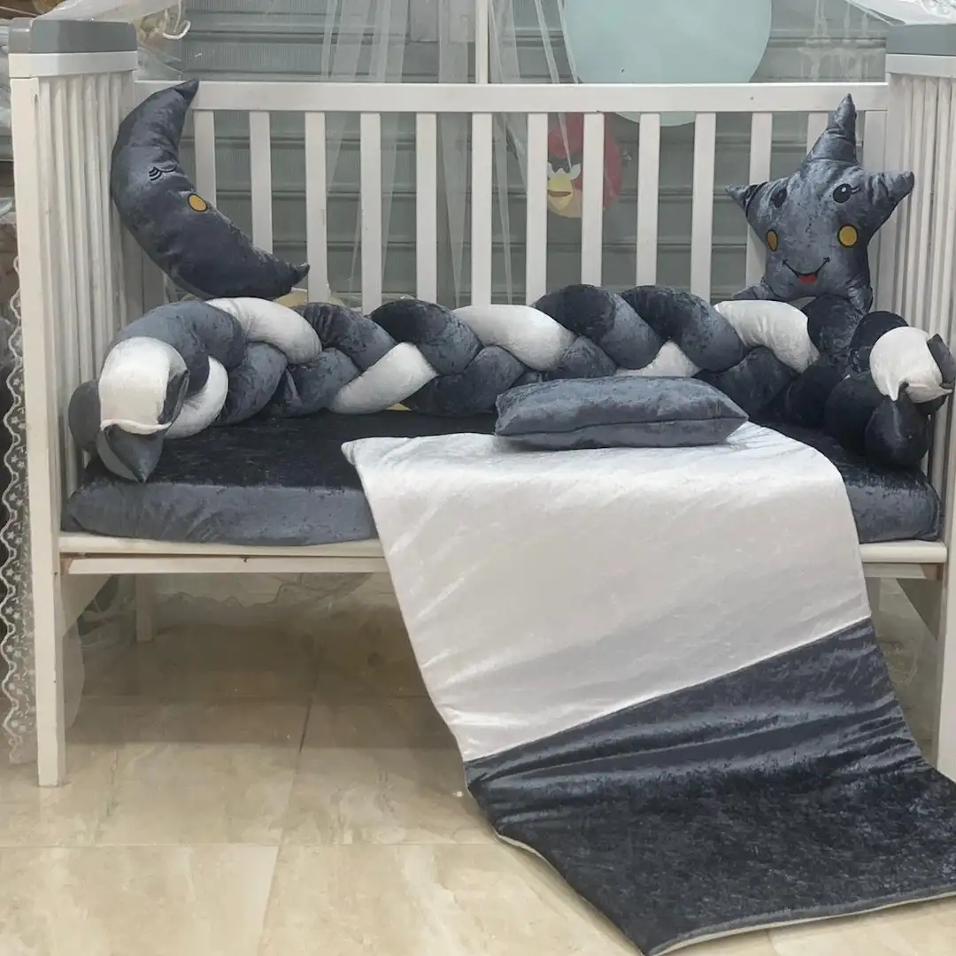 طقم مفرش سرير أطفال مخمل فاخر مصمم بعناية ليتناسب مع جميع أسرة الأطفال ذات القياسات المختلفة. يحتوي الطقم على جدلة حماية ناعمة ومبطنة، مثالية لحماية سرير الرضيع بأناقة، مع ناموسية شاملة لحماية الطفل من الحشرات والغبار، بالإضافة إلى وسائد زخرفية رائعة (غيمة، قمر، ونجمة ) تمنح ديكور سرير الأطفال لمسة فريدة. اللحاف وملف الفرشة مصممان بنعومة فائقة ليضفي شعورًا بالدفء والراحة لطفلك طوال الفصول.