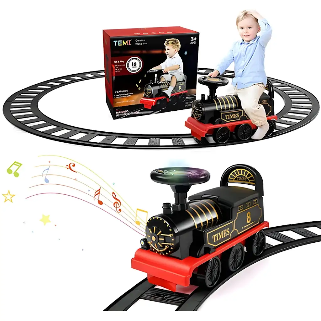 قطار كهربائي للأطفال 6 فولت مع مسار دائري 2.2 متر – لعبة ركوب بموسيقى وأضواء و16 قطعة سكة