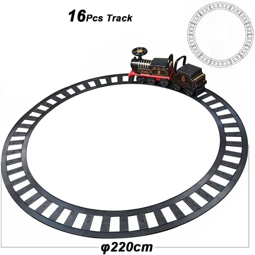 تتكوّن مجموعة قطار أطفال مع مسار دائري من 16 قطعة منحنية تشكّل دائرة قطرها 2.2 متر (7.2 قدم تقريبًا)، ما يخلق مساحة لعب مثالية وآمنة.