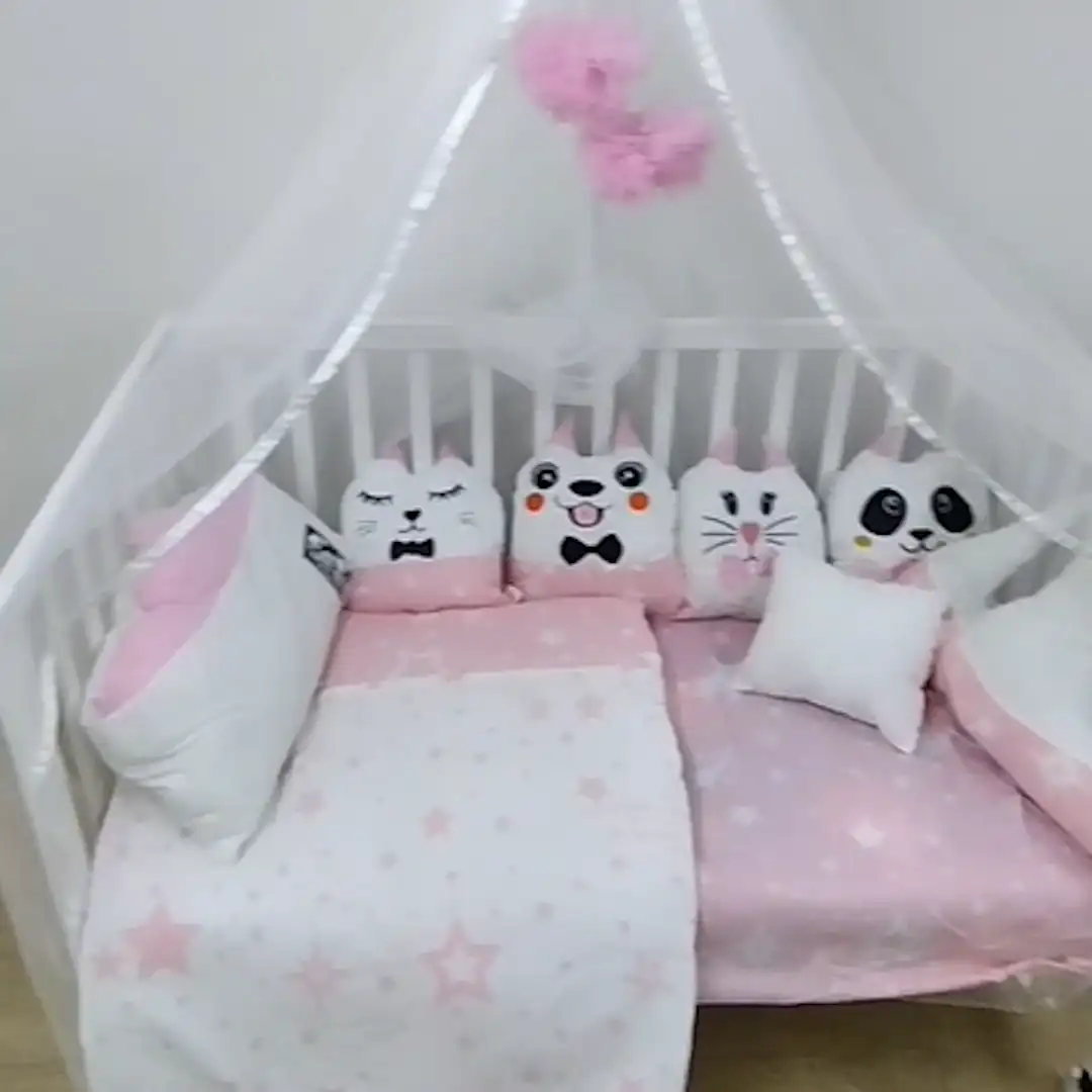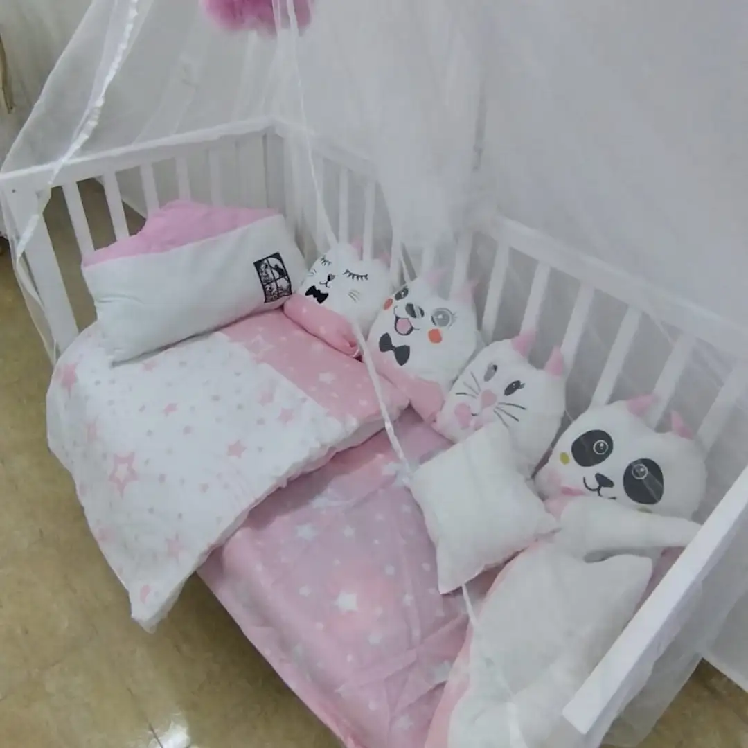 طقم مفرش سرير للأطفال بتصميم ألعاب مرح وألوان مبهجة، يوفر الراحة والحماية مع ناموسية شاملة طابات معلقة ووسائد مجسمة تضفي لمسة من المرح على غرفة طفلك.