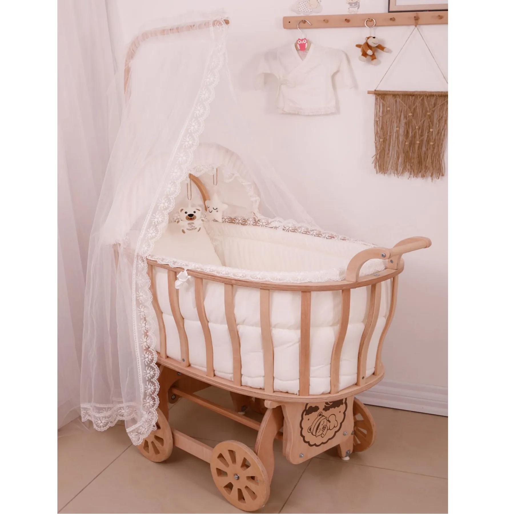 - مهد خشبي بتصميم عربة روما و مصنوع من خشب الزان الطبيعي المضغوط.