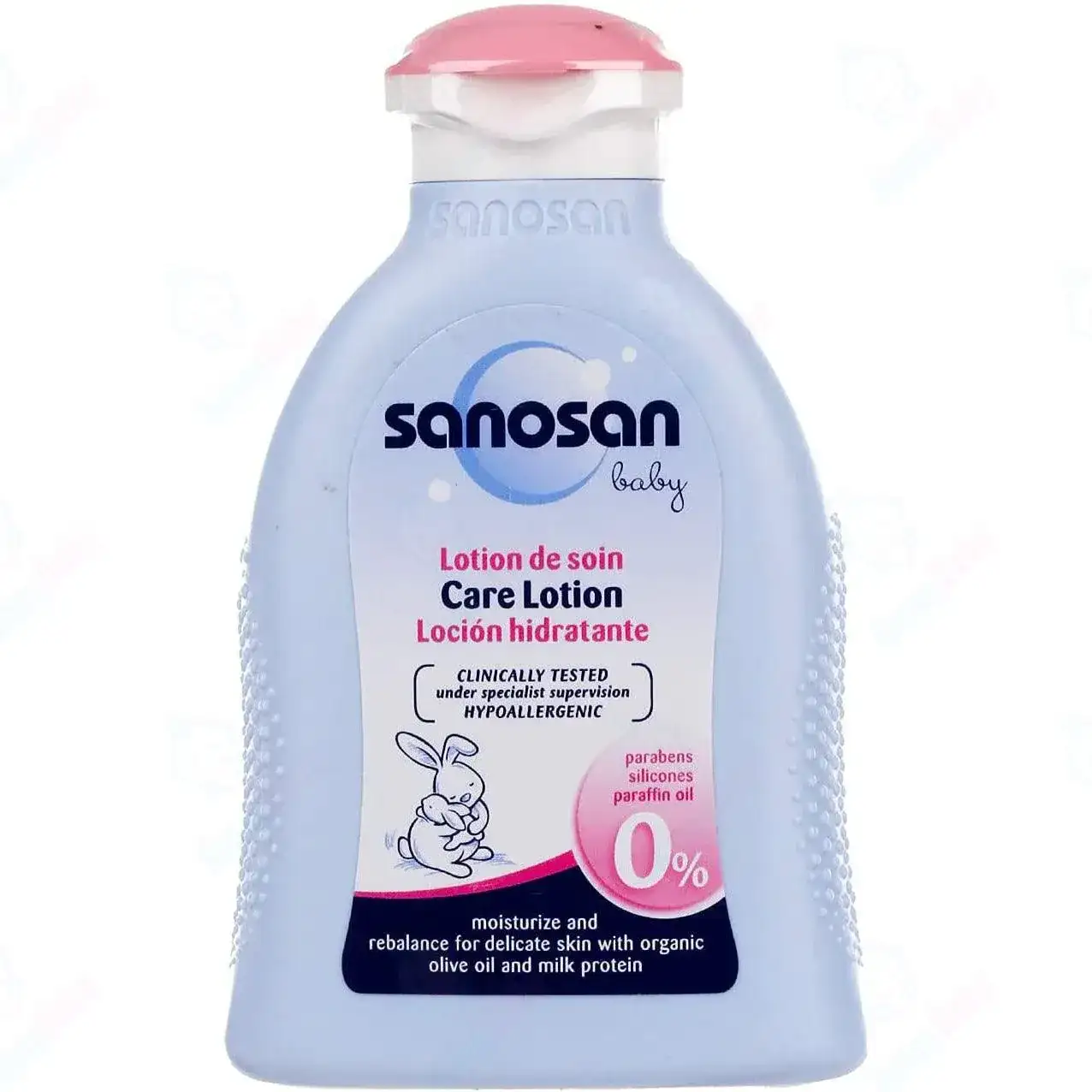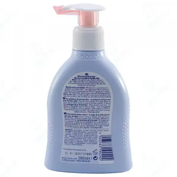 لوشن سانوسان مع بروتين الحليب الطبيعي – الأفضل من الحليب لبشرة طفل صحية. كريم ولوشن للعناية المثالية ببشرة الطفل الحساسة من البداية. تركيبة لوشن سانوسان مرطبة بالبانثينول والبابونج. يهدئ لوشن وكريم سانوسان البشرة ويرطبها لمدة 24 ساعة.