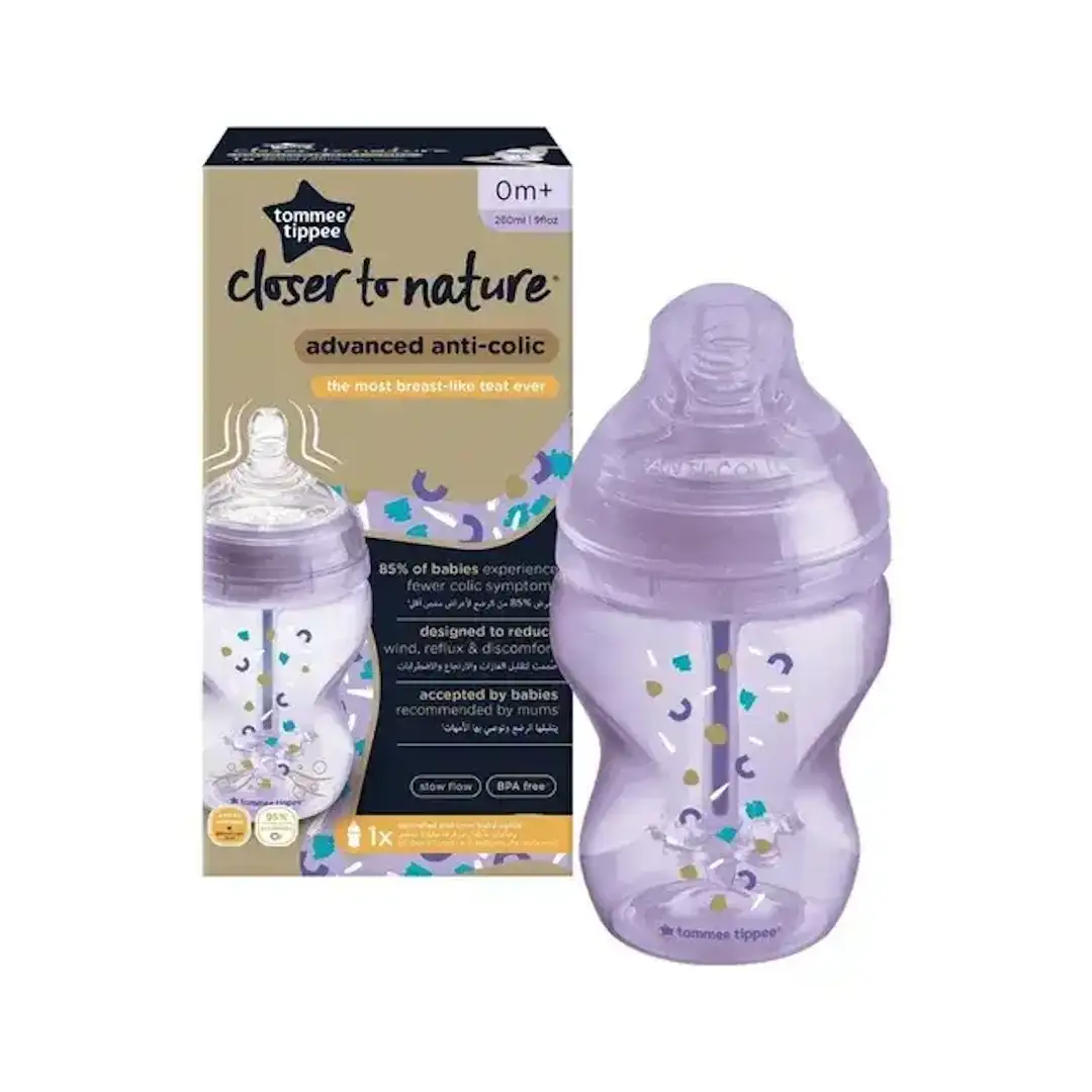 تتوفر رضاعة تومي تيبي المضادة للمغص بحجم 260 مل بلونين مميزين للبنات والأولاد، مما يجعلها الخيار المثالي للأطفال حديثي الولادة.