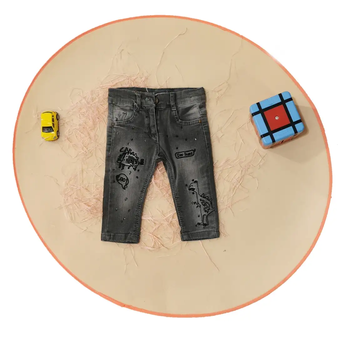 بنطال جينز بتصميم حديث مع حباكة الديناصور المميزة، بناطيل جينز باللون الأسود لإطلالة أنيقة لطفلك، بنطال جينز مريح وعملي.